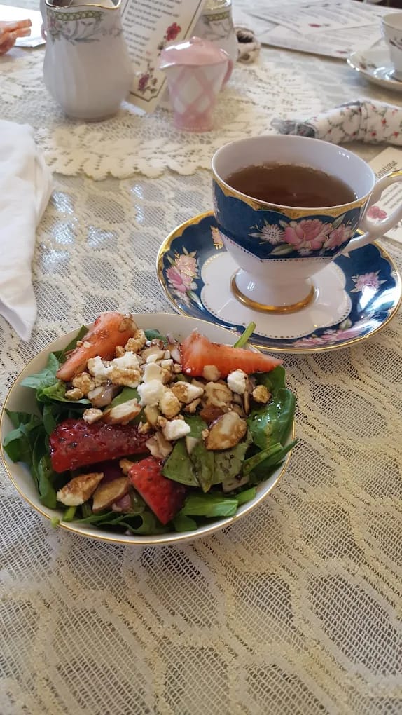They serve lunch Tuesday–Saturday (10am–3pm), and it’s actually substantial. Soups like roasted potato cheddar bacon, fresh salads, quiche, solid sandwiches — and desserts that will absolutely tempt you even if you came in “just for tea.”
